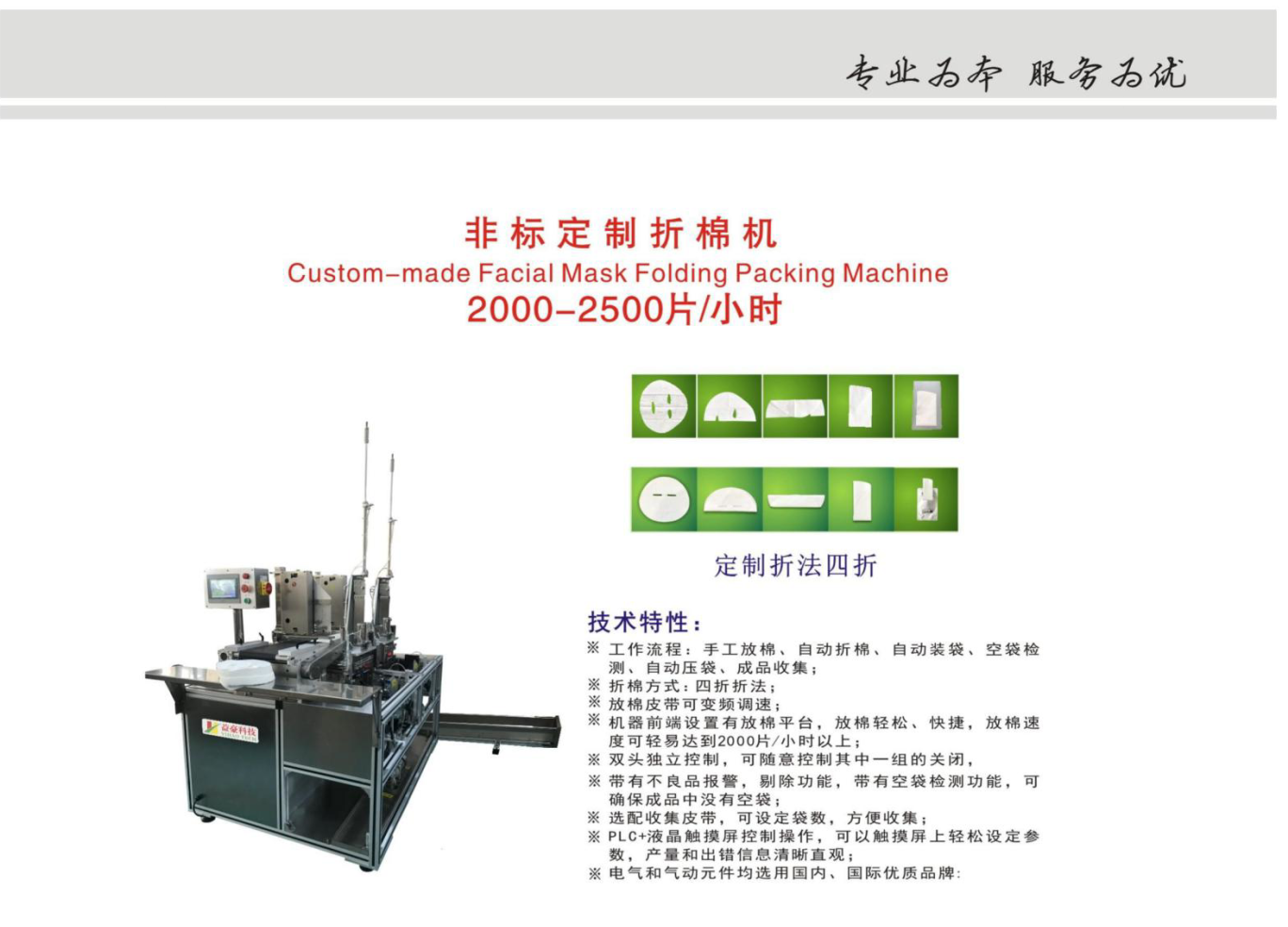 Working procedure: Put the try mask sheet and bags by hands-auto mask sheet folding-auto rotating-auto bagging –Auto empty bag checking—Auto bag pressing--auto bagging output;