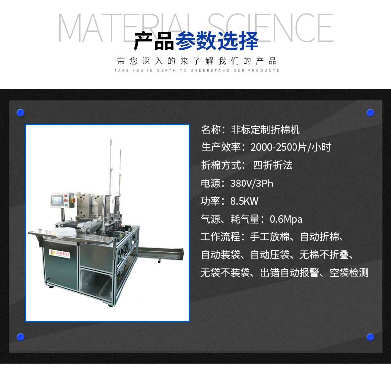 動作流程Working procedure | 手工放棉、自動疊棉、自動裝袋、空袋檢測、自動壓袋、成品輸出 Put the dry facial mask sheet and bags by hands- auto facial mask sheet folding- auto facial mask bag picking up and opening – Auto empty bag checking—Auto bag pressing-- auto bagging output |